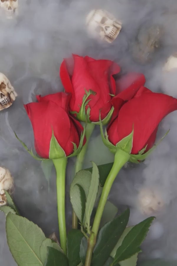 Embark on a visual exploration of nature's dichotomy with this evocative digital art video. It juxtaposes the delicate beauty of a vibrant red rose, symbolizing love and passion, against a haunting backdrop of ethereal skulls. The petals stand in stark contrast, representing the fleeting nature of life and the enduring presence of mortality. This striking imagery invites contemplation of the timeless cycle of life and death.