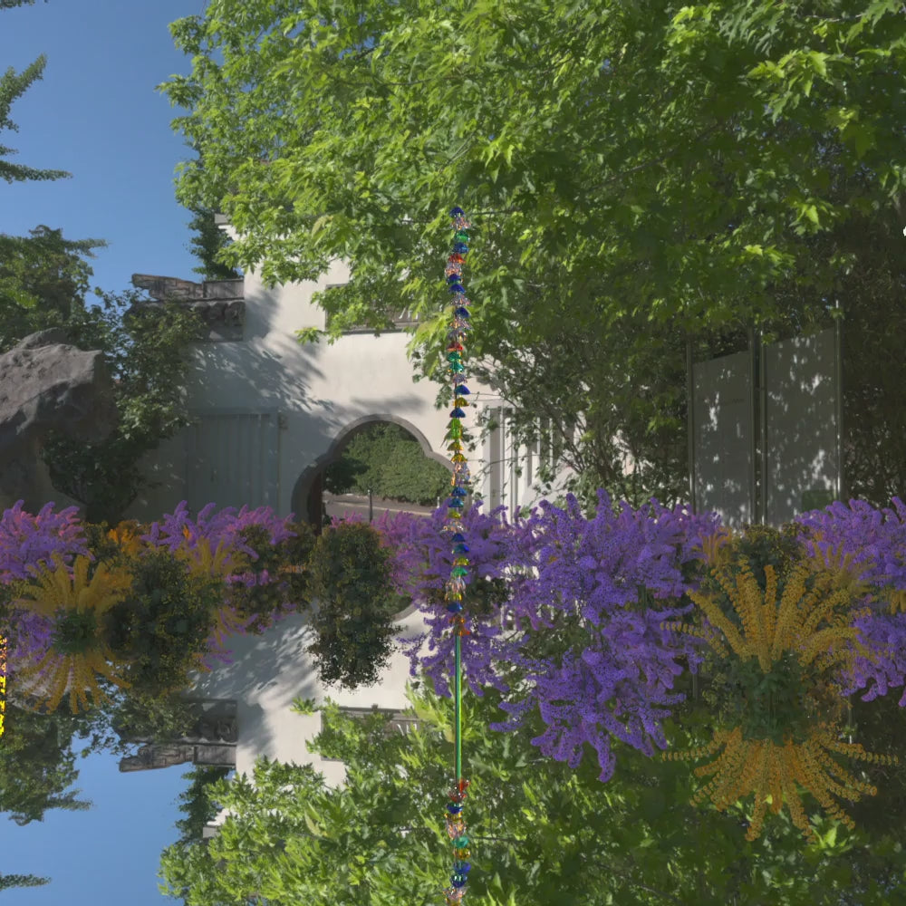 This piece features a striking, sculptural assembly of glossy, colored elements that resemble a fantastical plant. Set against a serene garden with a reflective pond, the sculpture's vivid reds and blues provide a bold contrast to the natural greens and purples of the background.