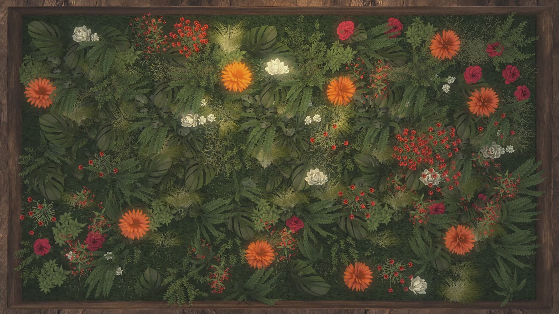 Enter a digital realm where nature's artistry is celebrated in its full glory. This video unveils a living wall of foliage and blooms, a dense tapestry of greenery accented by bursts of white, orange, and red flowers. Each element is rendered with lifelike detail, creating a botanical haven that pulses with the vitality of nature. Housed within a classic wooden frame, this lush composition brings the tranquility of a secret garden into the digital age.