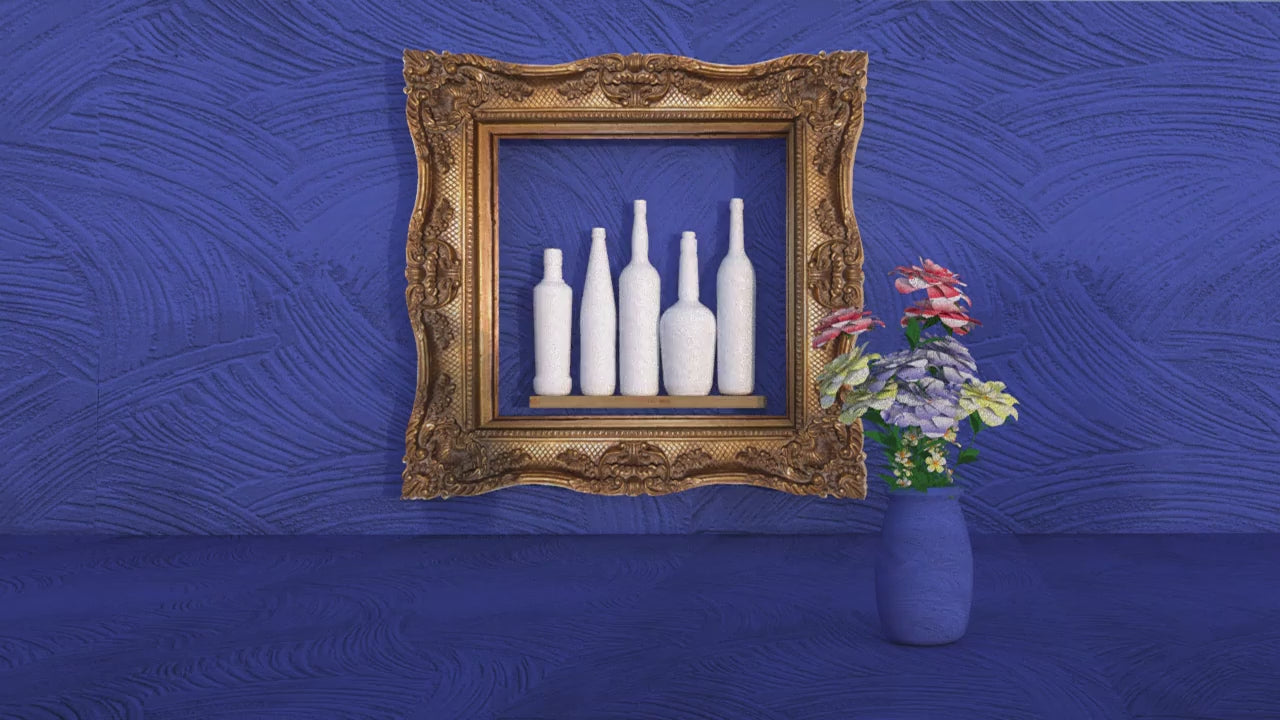 Inspired by Morandi's tranquil still lifes, this digital video composition elegantly arranges textured white vases within a luxurious golden frame, all set against a rich blue canvas. A toppled vase beside vibrant flowers adds a touch of modernity, creating a serene yet dynamic digital homage that bridges the gap between classic tranquility and contemporary vibrance.