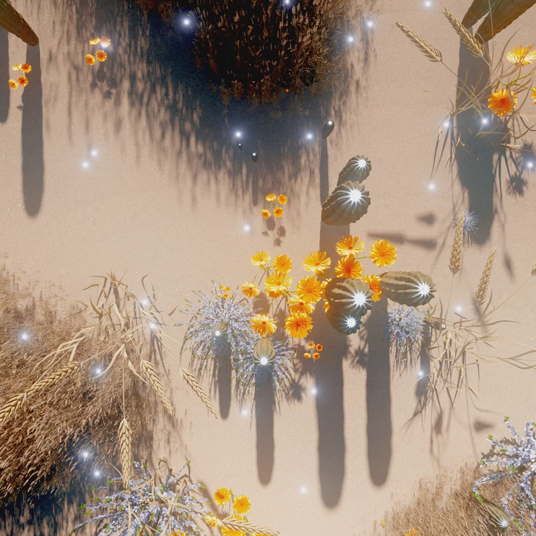 Witness a dance of light and shadow in this digital art video, as a stunning array of desert blooms and cacti bask in the soft glow of sunlight. The dynamic interplay of light casts an intricate pattern of shadows, creating a tranquil yet vibrant tableau that celebrates the resilience and beauty of desert flora.