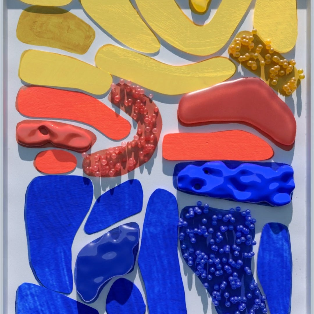 Step into a world of bold abstraction with this captivating digital art video. It features an array of playful shapes in primary colors, each with unique textures and dimensions that pop against a neutral background. The composition is a celebration of form and hue, with each element carefully placed to create a harmonious balance that is both dynamic and engaging.