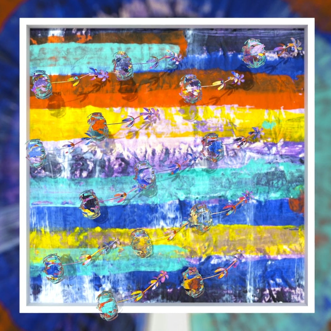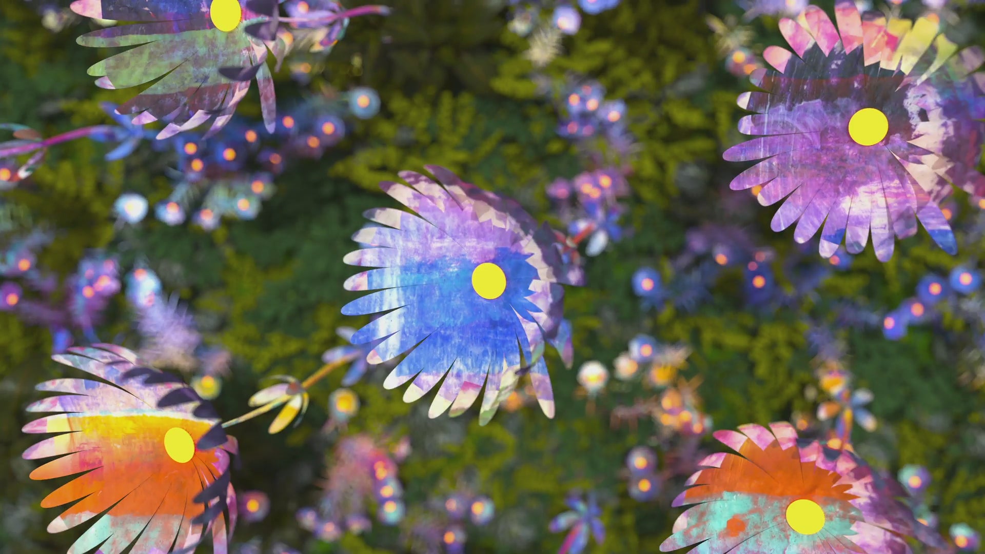 Immerse in the serenity of this digital art video, where a lush array of wildflowers blooms within a stark white planter, set against a vivid backdrop that blends the fluidity of watercolors with the warmth of a sunset. The scene is crowned by a harmonious sunburst, infusing the flowers with a radiant glow that accentuates their rich textures and colors.